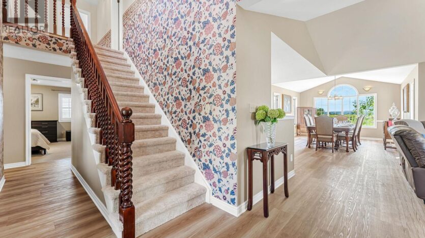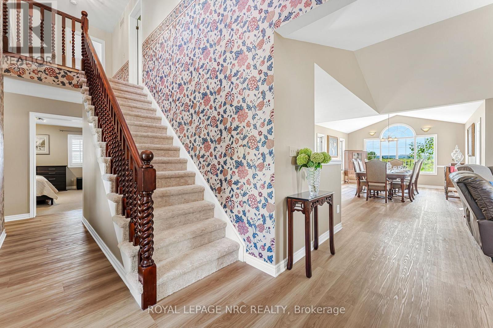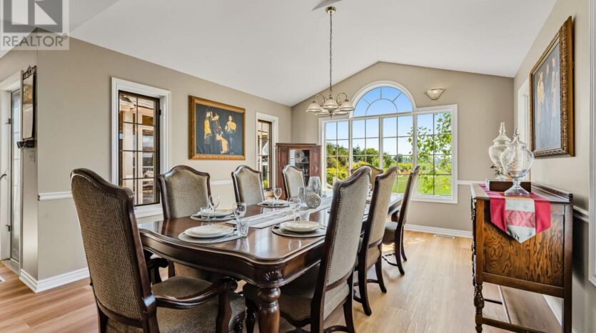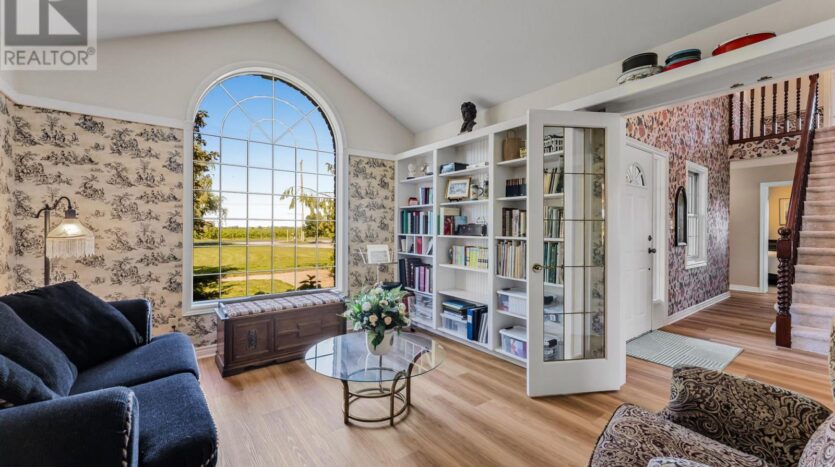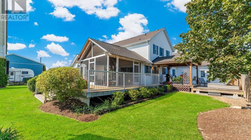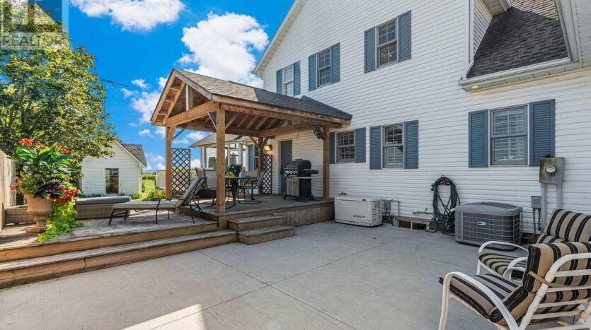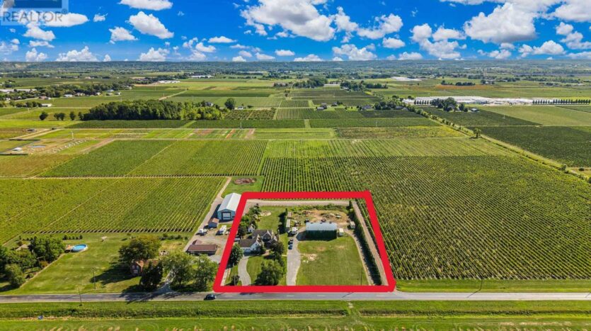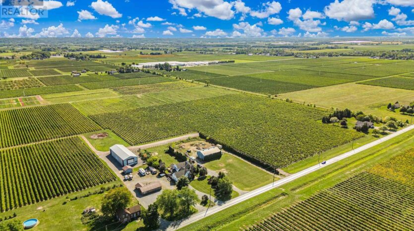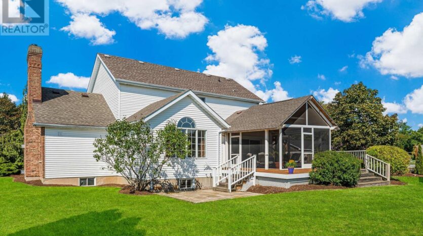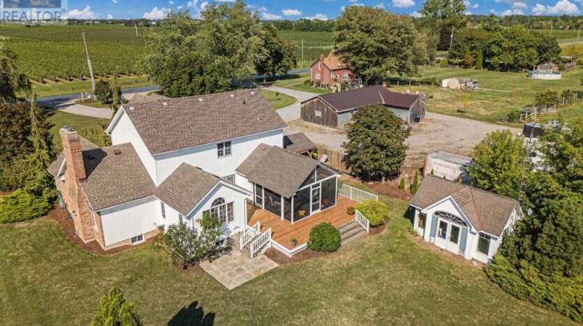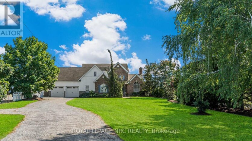 Beautifully maintained custom 2-storey home situated on 2 picturesque acres, surrounded by vineyards! This 3368sqft home showcases several living spaces, ideal for multi-generational & growing families. Welcoming front porch leads into a spacious foyer. French doors open into a lovely den/music room with a cathedral ceiling and a large window overlooking the landscaped front yard. The living room has a focal fireplace, flanked by beautiful windows. This house is designed for entertaining. The kitchen is the centre of the home. Sit down and sample a glass of local wine at the oversized centre island and enjoy an amazing meal with family and friends in the formal dining room. Generous main floor laundry room opens opens to screened-in15x14 porch and to a separate covered deck, ideal for barbecuing in any weather. The main floor also includes a two piece guest bathroom, and the primary bedroom suite with double entry doors, walk-in closet and updated 3-piece ensuite bath. Stand-alone glass shower with rain shower head for the perfect spa experience. Spacious mud room off of the 2 car garage has large double closets and leads into a very spacious office with separate entry. Primary bedroom/ensuite/office have California shutters. On the second floor, two bedrooms share a generous jack and jill bath, each with their own vanity. The second bedroom has a gorgeous window seat overlooking the backyard and the lush surrounding vineyards. The third bedroom, upper hall and stairs showcase brand new carpeting. The second floor also includes a huge bonus room, as well as a large dressing room custom furnished by Closets By Design. The basement is the perfect in-law suite with over 1300 sqft of living space, private entrance, and brand new flooring, gas fireplace and all new kitchen appliances! New furnace and hot water heater as well. 40×60 machine shed has 2 large bays perfect for large vehicles and equipment. One side also serves as a workshop with heated floors!